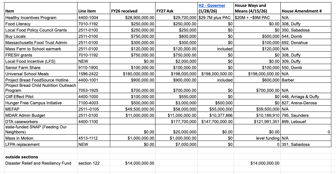 On Wednesday April 15, 2026 the House Committee on Ways and Means released its fiscal year 2027 budget proposal. The budget includes a number of important food system programs; $198 million for universal school meals, $29 million for the Healthy Incentives Program, another infusion of $14 million in the Disaster Relief and Resiliency Fund, $60 million for MEFAP, and more. We appreciate House leadership’s support for HIP, and a climate resilient local food system. The proposal also contains proposed cuts to the MDAR and DTA agency budgets, which we are concerned about.